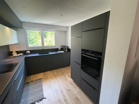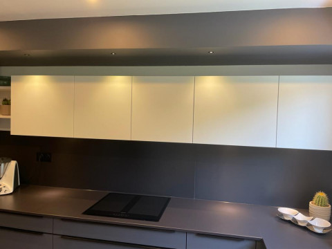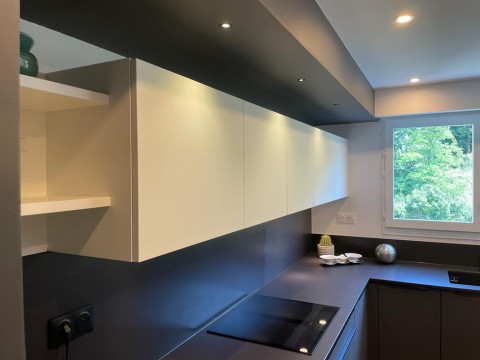 Cuisine bicolore noire et blanche pour un esprit sobre et moderne. Pour garder cet esprit moderne nous avons choisi avec notre client des poignées profilées noires et un magnifique plan de travail en dekton.