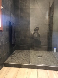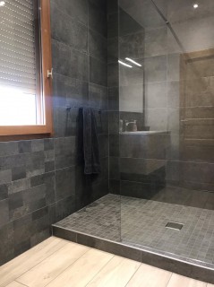 Salle bains avec douche italienne sur mesures et bonde inox emboutie à la Forteresse